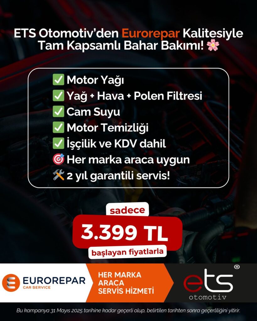 Yaz kampanyamız başladı! Motor yağı, yağ filtresi, hava filtresi, polen filtresi, cam suyu dolumu ve motor temizliğini içeren Eurorepar bakım paketimiz sadece 3.799 TL’den başlayan fiyatlarla ETS Otomotiv’de sizi bekliyor.